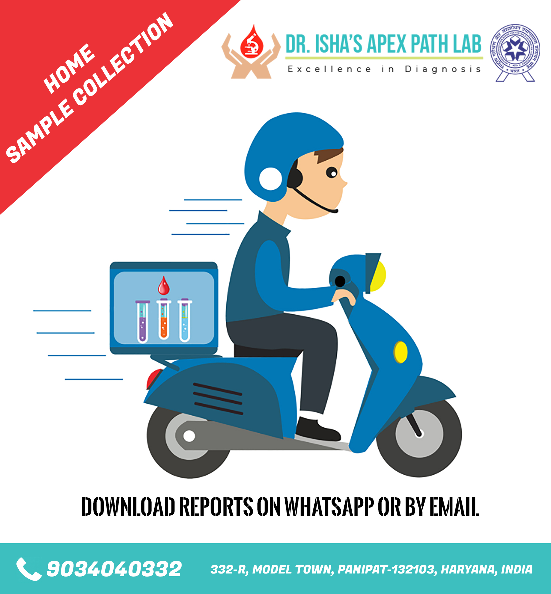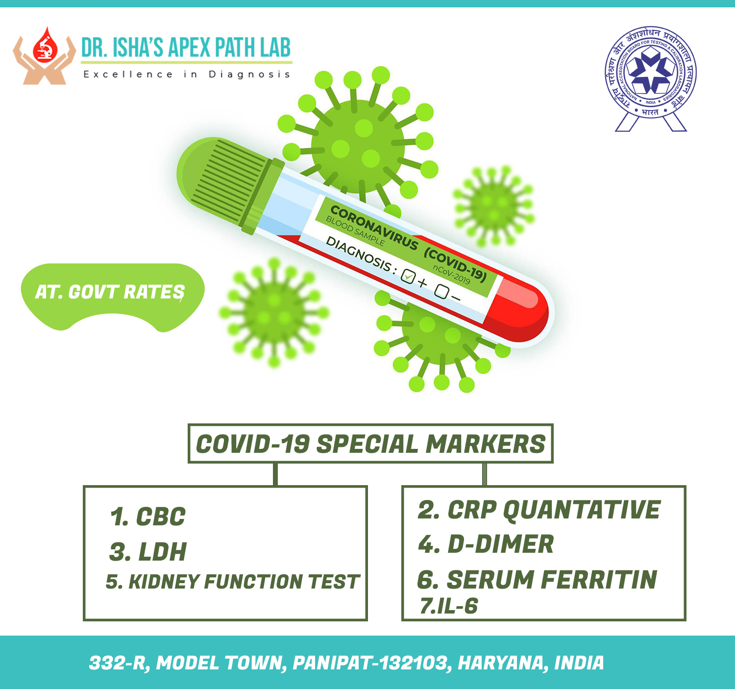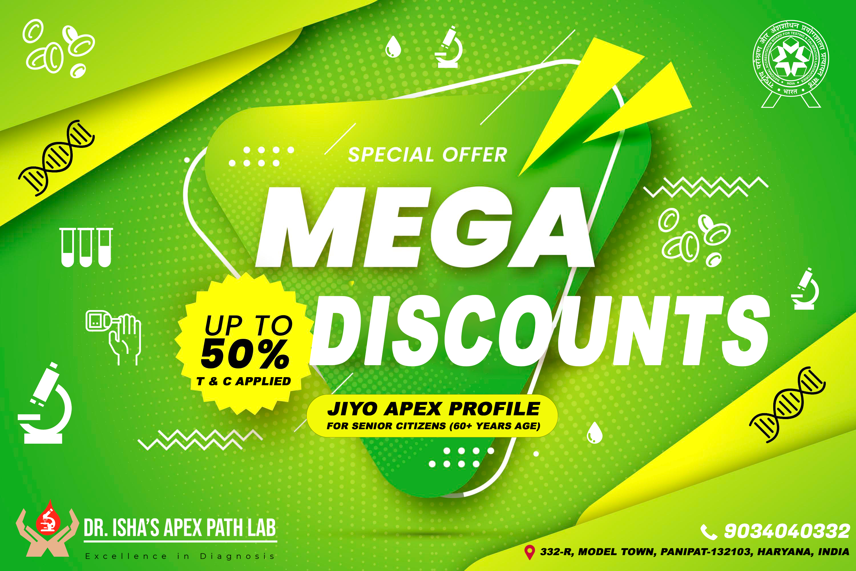 Dr. Isha’s Apex Path Lab is the first STAND ALONE NABL Accredited laboratory at Panipat City. It is a unit of Gupta Eye Hospital, started by Dr. Isha Gupta, MD, Pathology in the year 2014. Our laboratory is dedicated to comprehensive, high-quality test results with automated lab testing at affordable prices. All types of tests in Haematology, Biochemistry, Serology, Clinical Pathology, Microbiology and also ECG, TMT, Pulmonary function tests are performed that helps to understand all bodily functions that is crucial for a healthy lifestyle.